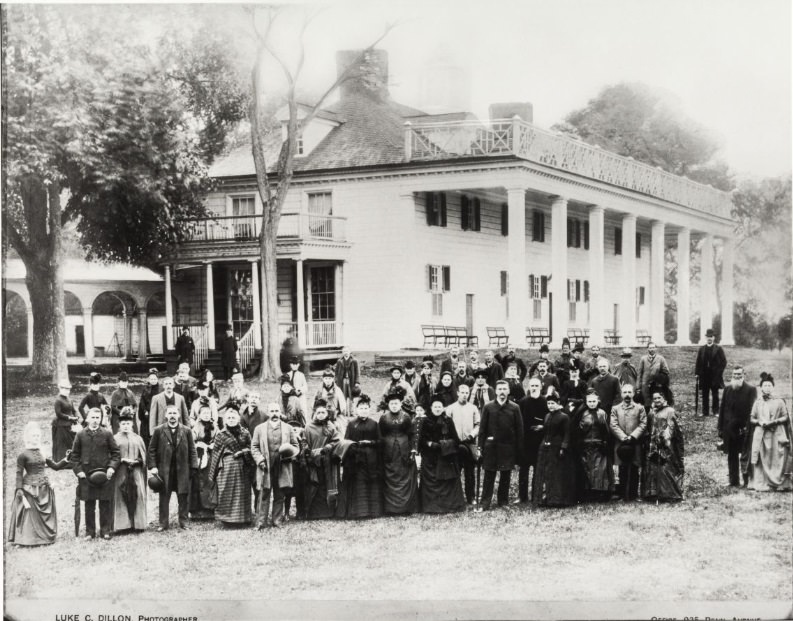 Luther Burbank at Mount Vernon – Retouched. Burbank is near the center of the photo, hatless, with long sideburns.