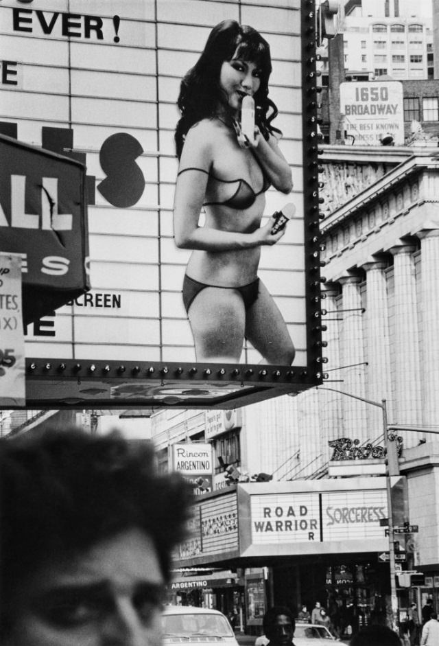 Cinema signs on the Rivoli Theatre and surrounding cinemas on Broadway advertising adult films and shows, New York City, 1983. (11/58)