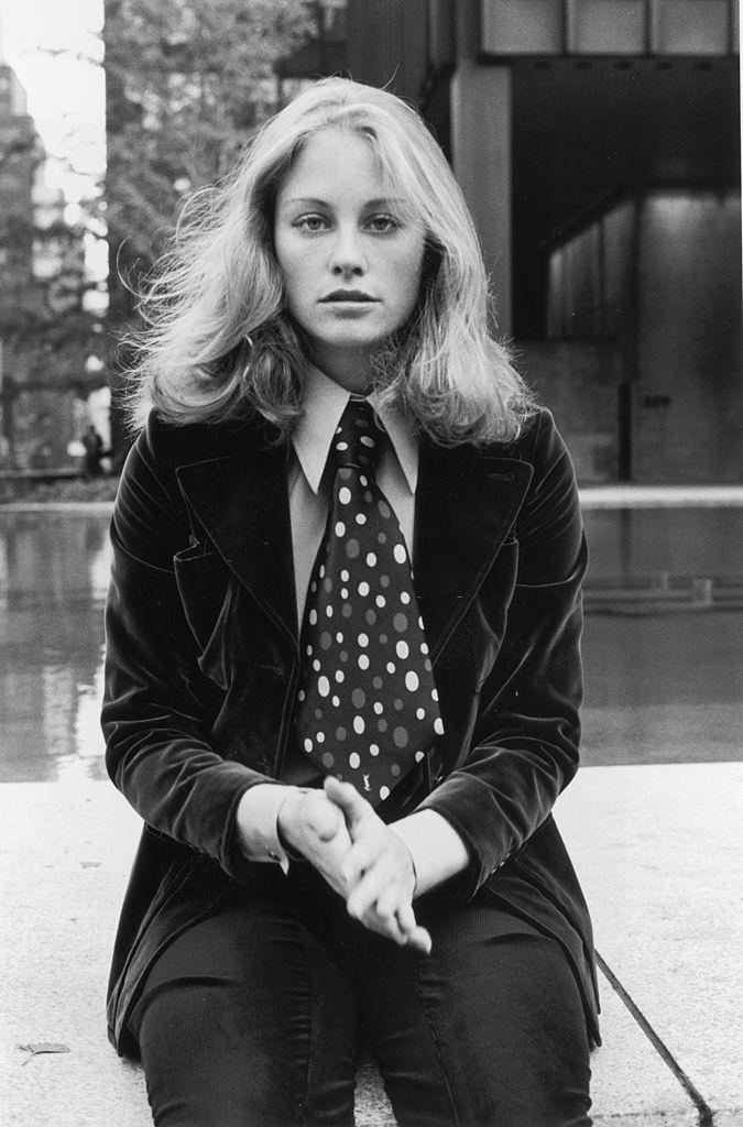Cybill Shepherd sitting on a concrete wall in front of a fountain, 1971. (34/52)