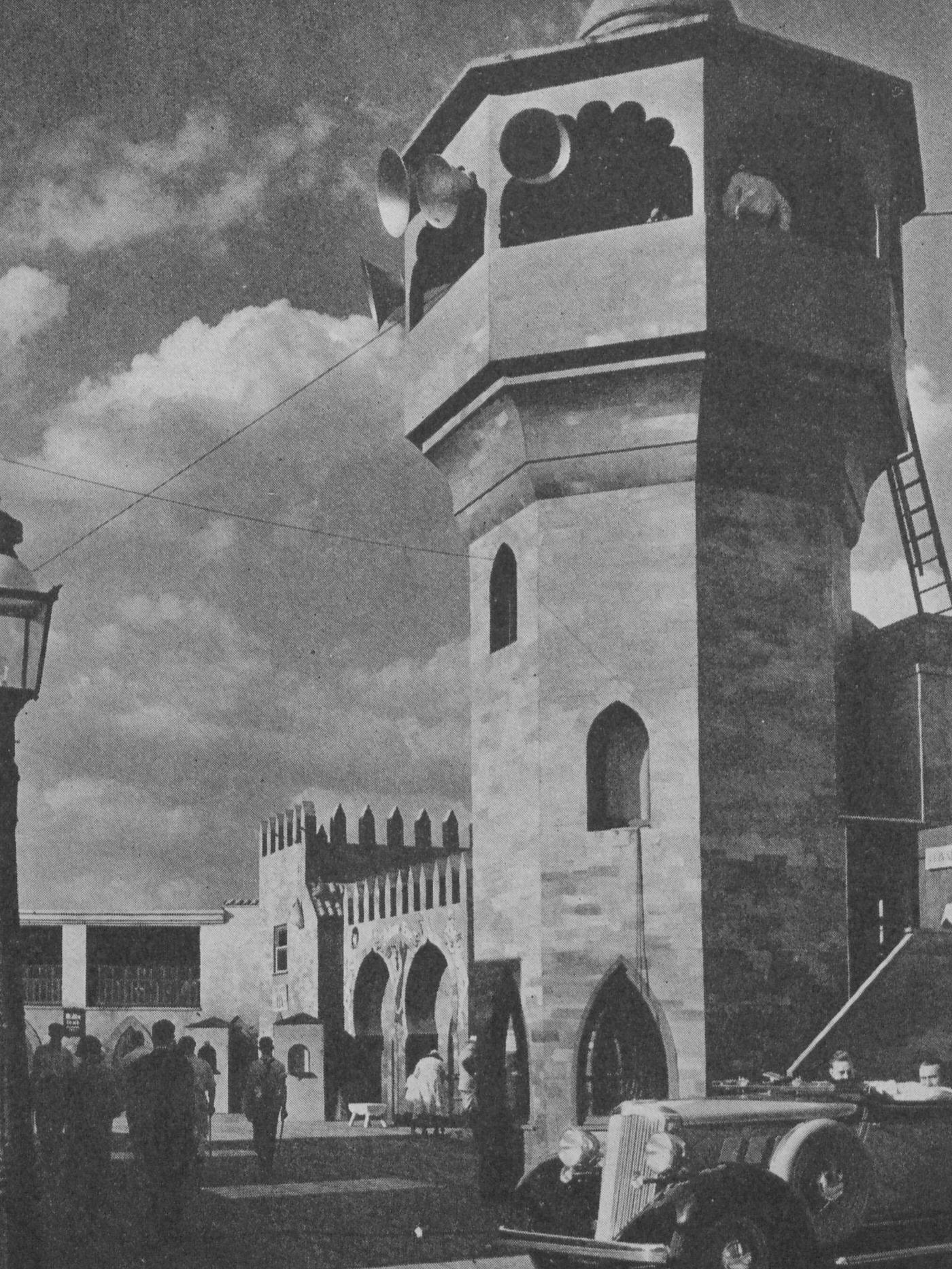 #106 Loud speakers protrude from the Hollywood Tower at the Century of Progress International Exposition (1934).