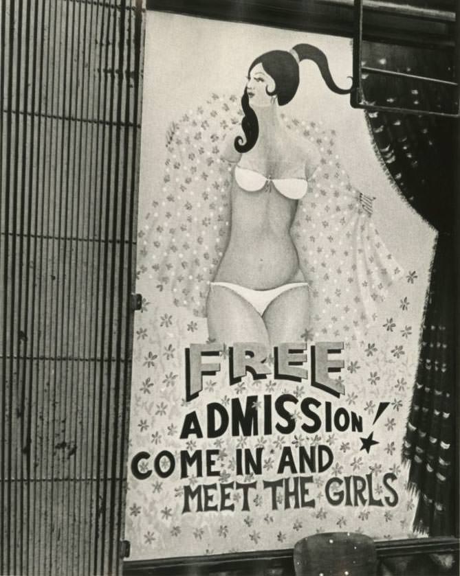 It wasn’t all better back then. The conditions were grotty and dangerous. The clubs were wild, the music daring, and the drugs plentiful. The only way to get from your dealer to your apartment was to pull off your heels and run with your keys tangled between your fingers. Sex was the main product on 42nd Street. The big narcotic was administered through a sticky stool and a peep show hole to get the blood pumping. Gordon shows us homemade signs that advertise ‘body rubs’ and ‘massages,’ both of which refer to on-the-clock masturbation and fast cures for erectile dysfunction and loneliness. These signs advertise pleasures of the flesh within with a cottage industry feel.