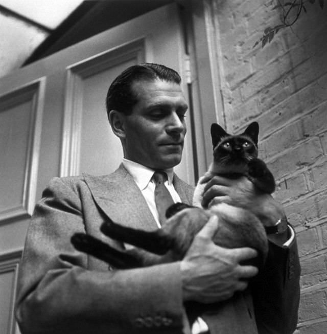 Laurence Olivier with the family cat ‘New’ at home at Chelsea, London, 1946 (15/69)