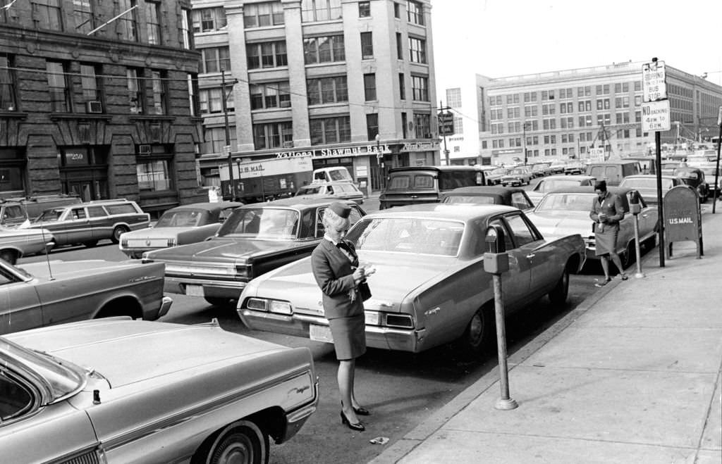 #115 Meter maid Mary Martin makes her rounds in Boston on Jul. 7, 1966.