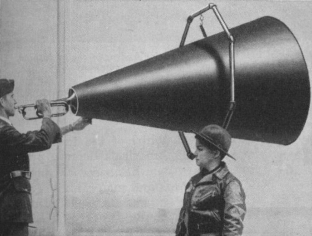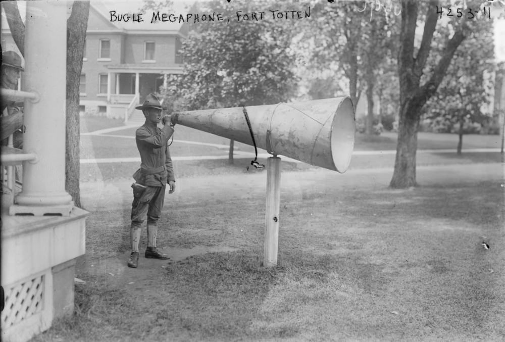 Military garrisons used bugle megaphones to amplify the sound of the bugle. Usually, these pedestals were located near the main flagpole or at garrison headquarters. The bugler could use the megaphone in any direction and the sound would carry over a broader area when mounted on a post swivel to use in a garrison environment.