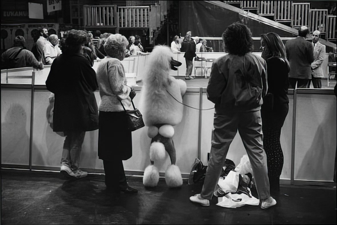 Erwitt’s sense of humor shines through in his dog pictures. Take “California Kiss” for example. Two dogs smooch on the beach, their bodies perfectly aligned with a passionate couple behind them. It’s a hilarious moment, showing how dogs can unknowingly mimic human behavior.
