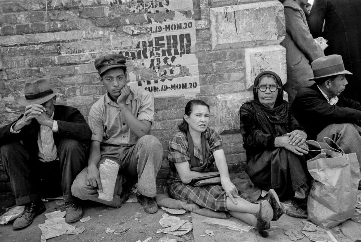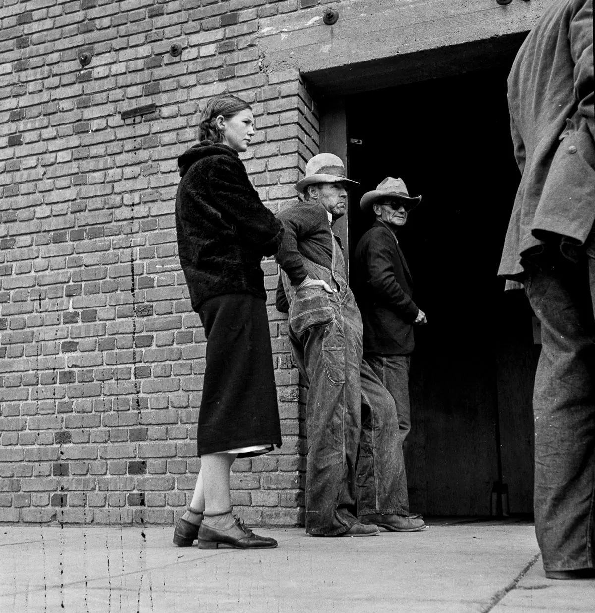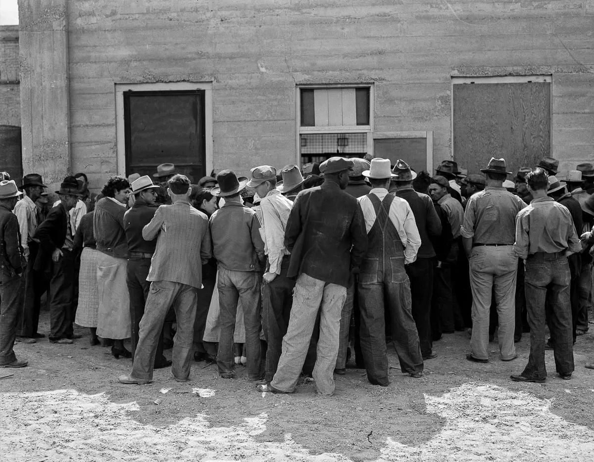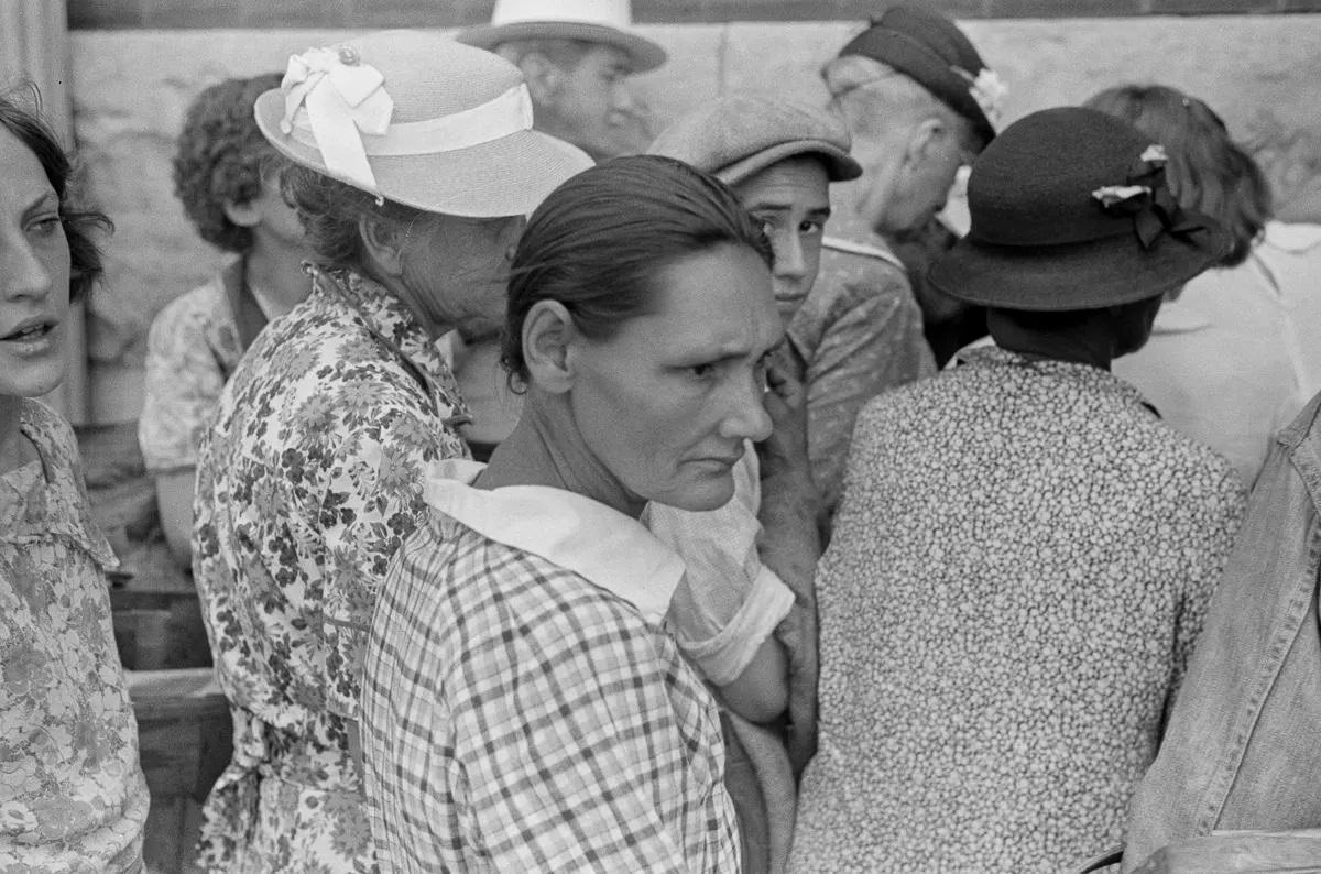 The historical photos depict agricultural labourers’ acute anxiety and stasis as they wait in line for the emergency aids that will keep them and their families alive for another few days.