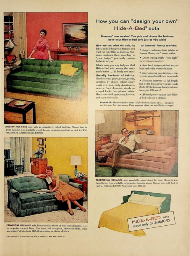 In April 1940, the Simmons Mattress Company introduced the Hide-A-Bed, an innovative fold-out sleeper sofa that was another of the company’s success stories. This sofa doubles as a couch until you remove its cushions and discover the spring-loaded metal frame and mattress underneath. The mattress swung up and out upon pulling on the handle or structure, then folded open to become a full-sized bed.