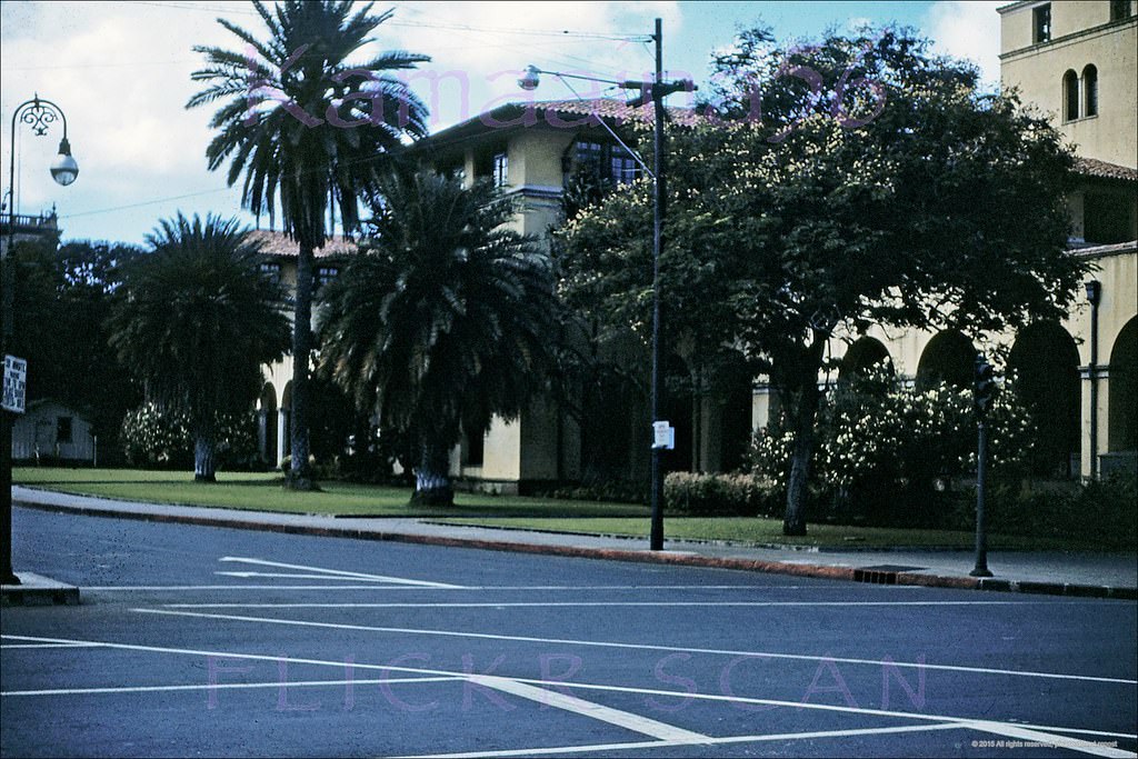 #52 The 1949 administration building at the University of Hawaii’s Manoa Valley campus in Honolulu. Vantage point is the corner of Dole Street and University Avenue, 1951