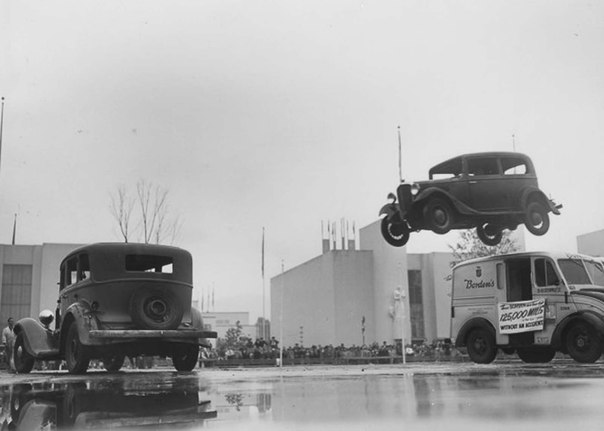 Jimmie Lynch, an automobile daredevil and stunt car performer, started his career in the 1930s. He and his fellow daredevil drivers crashed cars and entertained the public. The men leaped over cars and trucks, smashed through flaming walls, and sent their vehicles tipping over on two wheels. Lynch was known for riding on the hood of a ‘horse car,’ which he steered with hydraulic cables.