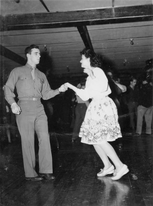 Female dress styles in the 1940s typically had boxy shoulders, slim-belted waistlines, and lower hemlines, like a uniform. You might see women wearing long-sleeved dress suits of a similar shape during cold weather. Hairstyles in the 1940s were typically shoulder-length or longer, without bangs, and styled with waves and rolls. Women used the “victory roll” to manage their long hairstyles during a hard day’s work; they unrolled it later to form shapely waves.