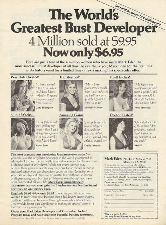 The Mark Eden bust developer was a device and regimen that promised to enlarge woman’s breast. This product was built in the early 1960s and marketed in women’s magazines during the 1960s and 1970s. Their ads claimed lofty and impossible results such as “For thousands, Mark Eden has transformed flat bustlines into the firm, shapely fullness.”