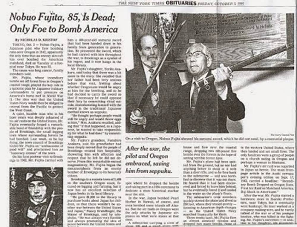 Fujita would later return to the United States as an emissary of peace, visiting the town of Brookings, Oregon, where the bombing occurred. He met with the mayor, gave a speech, and apologized for the bombing. He also presented the town with a traditional Japanese sword as a gesture of goodwill. He would die in 1997, never giving up his belief in the importance of peace.