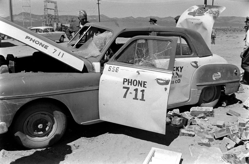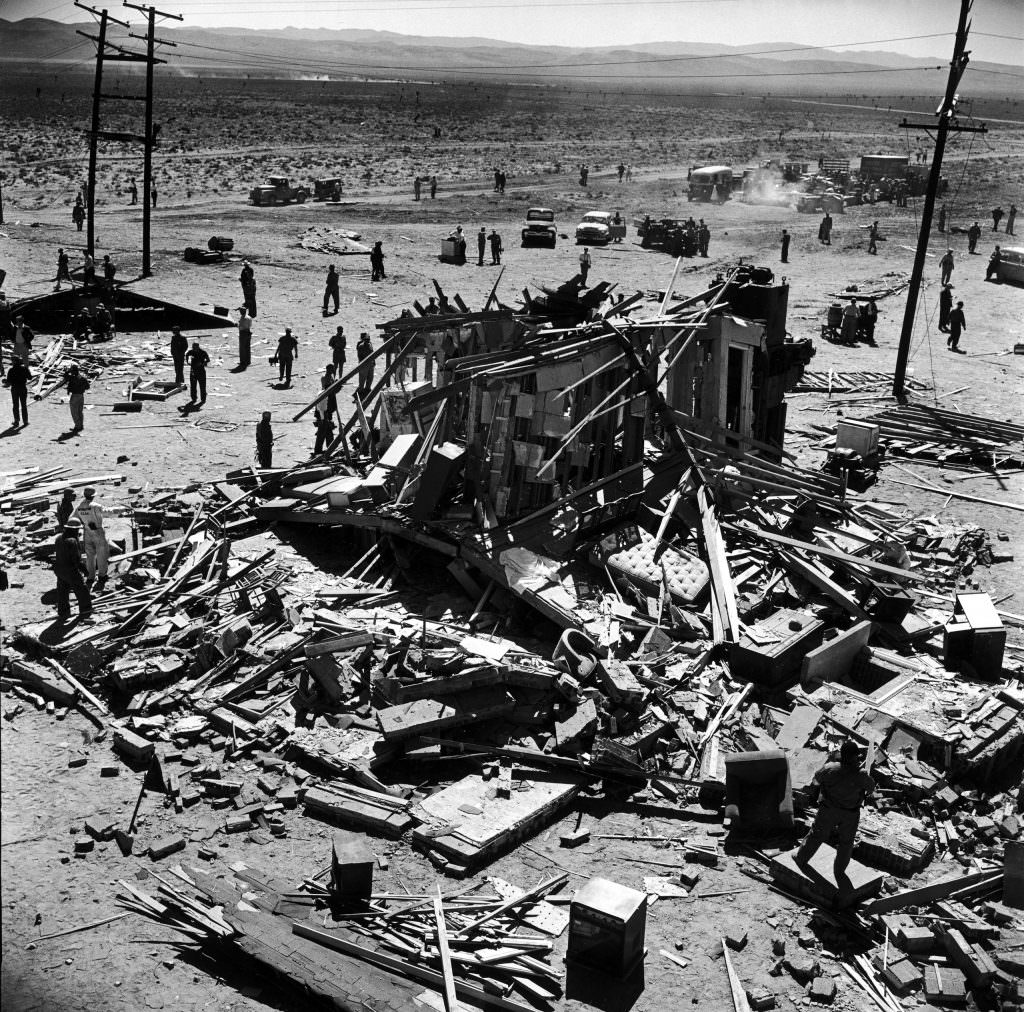 The desert landscape is transformed, with craters marking the ground where the bombs detonated. The intense heat has melted the sand, creating strange, glassy formations. These images are a stark reminder of the lasting impact of these tests, both on the environment and on the human psyche.