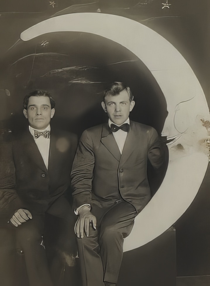 In the early 1900s, photographers came up with fun ways to make portraits stand out. One of these ideas was the Paper Moon studio photographs. These pictures show people posing in front of or on a giant paper moon prop. The results were playful and creative, capturing the imagination of those who saw them.