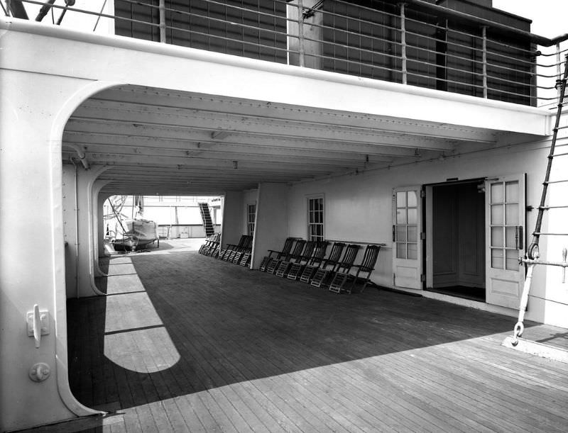 #35 2nd Class Promenade aboard Aquitania. The starboard side of the Promenade Deck (A Deck), with a view of the sheltered area under the Boat Deck aft, May 1914