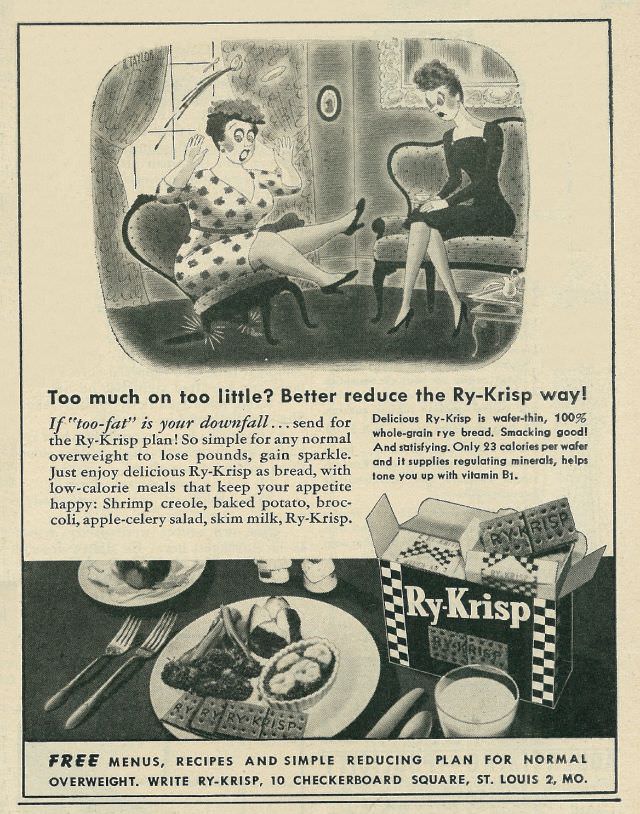 Rye-Krisp started advertising its products in magazines marketed to women and young girls starting in the 1930s as a “reducing” (or “weight loss”) product. The brand originally appealed to Scandinavian immigrants who were comforted by eating rye crackers, but after being acquired by Purina in 1926, they changed their marketing strategy. Ry-Krisp usually used timeless and compelling marketing themes like, “your husband is going to leave you for a skinny girl” and “caddie girls are going to laugh at your fat ass if you don’t buy our product.”. They even ran ads like “Nobody loves a fat girl” in Seventeen magazine for years. Below are some examples of offensive ads by Ry-Krisp, fat-shaming vintage advertisements for Ry-Krisp crackers from the 1930s, 1940s, and 1950s.