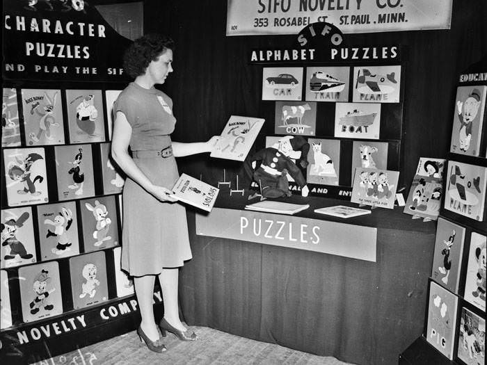 #56 Mrs. Julian Ashheim looks over display of puzzles, 1946