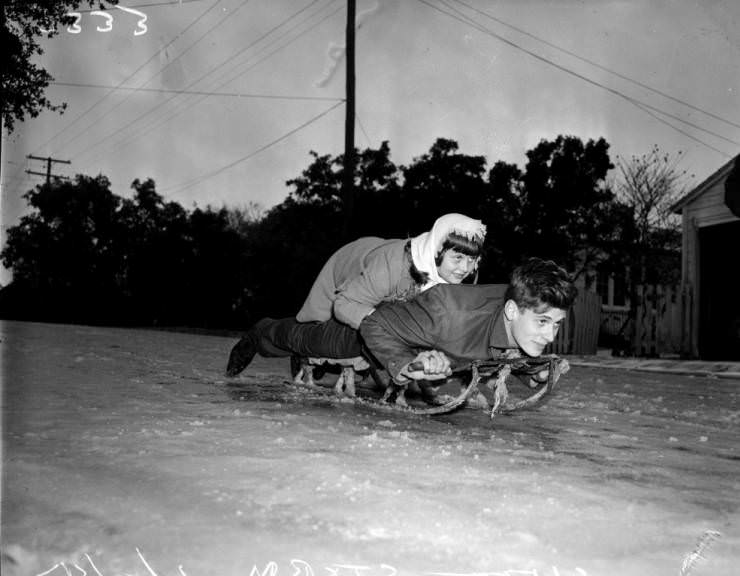 #94 Sledding in San Antonio? Kay Hornaday and Ray Conder ride a snow sled down an icy hill in Alamo Heights, 1946