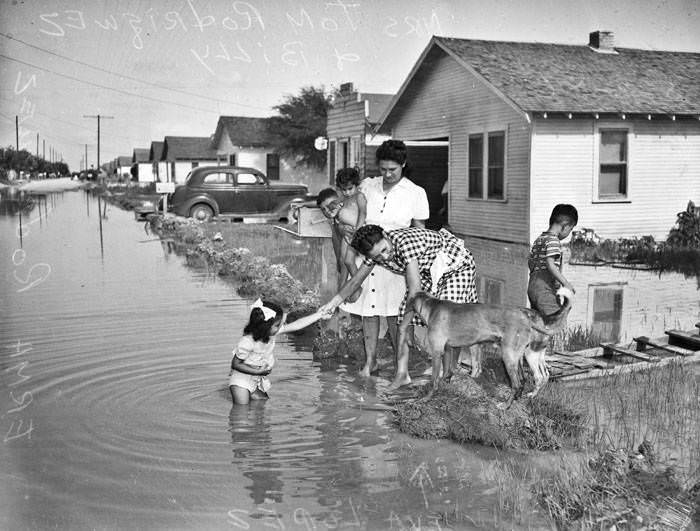 #5 Crowds watch a wrecker pull a car from flooded San Pedro underpass, 1948