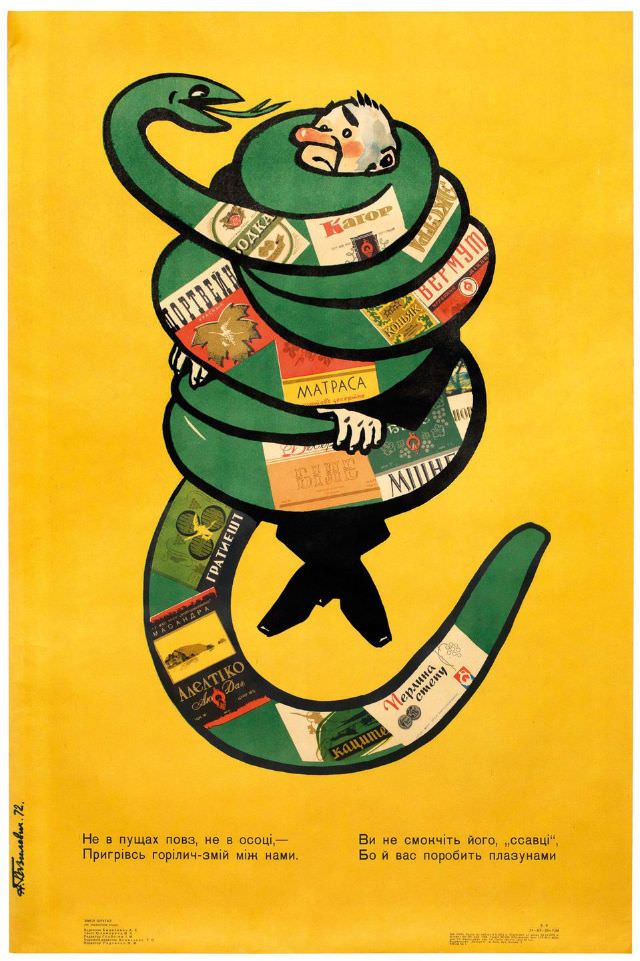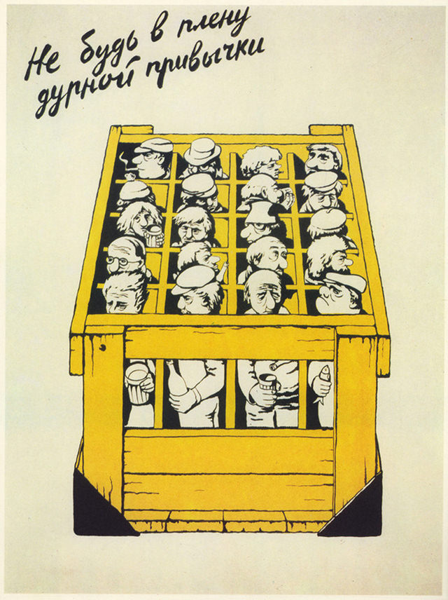 The following posters were used to warn the public about the dangers of excessive alcohol consumption. With striking, colorful graphics and stark metaphors, the posters cast alcoholism as a snake choking the life from vivacious young men, a bottle as a prison, and more. Drinkers grow slothful and lazy, abandon their families, endanger their coworkers, or become murderous brutes.