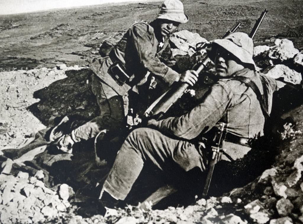 #28 Government troops have a meal in their front line trench during the Spanish Civil War.
