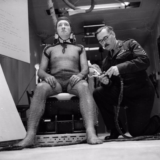 #13 Dr G. H. Byford stands under an optokinetic drum wearing a contact lens with a miniature lamp cemented to the lens, during an experiment to investigate the reflex movements of the eyes and their association with visual illusions, at the RAF Institute of Aviation Medicine in Farnborough, 1960s.