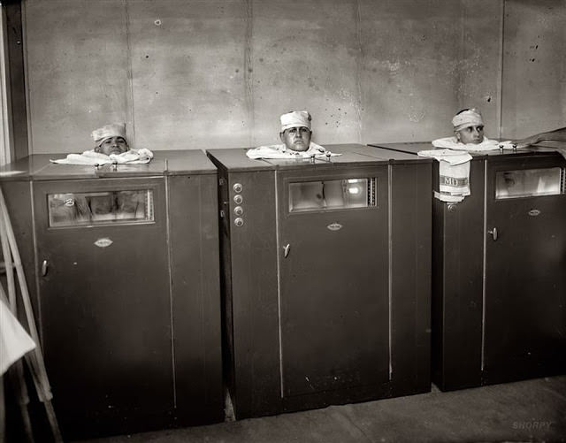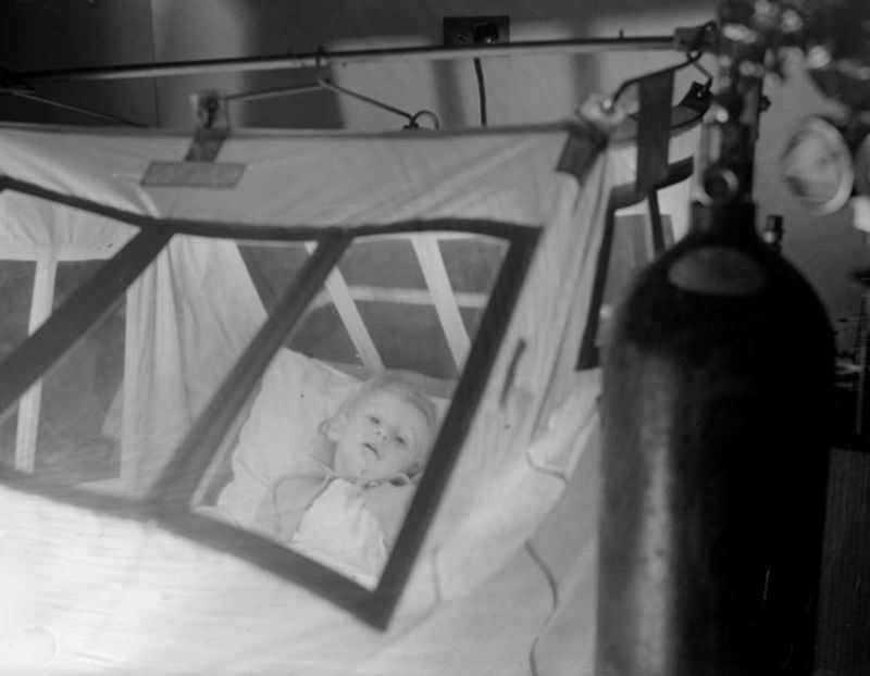 #1 Stacking up polio sufferers in a multi-person iron lung, circa 1950.