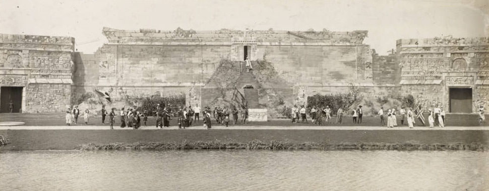 #24 Men, women, boys and girls costumed as Maya Indians line up on the set, a plaza before the ancient temple of Maya civilization, in a scene from the Masque, Pageant and Masque of St. Louis, 1914
