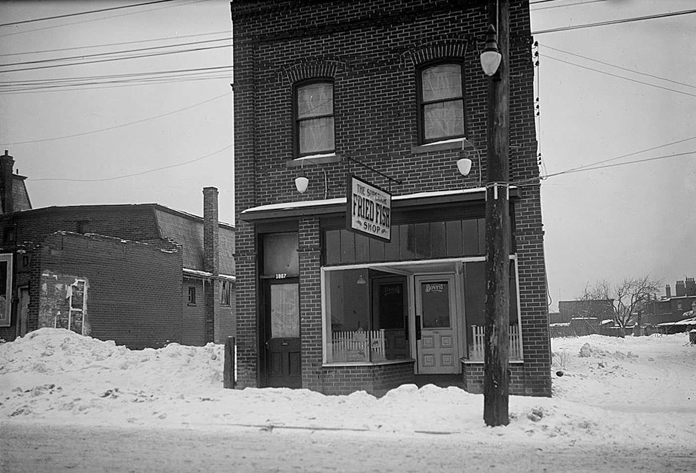#38 Bentley’s Fish and Chips on the north side of Danforth Avenue, near the Grover Theatre, at 2714. View is looking east on Danforth Avenue, 1928