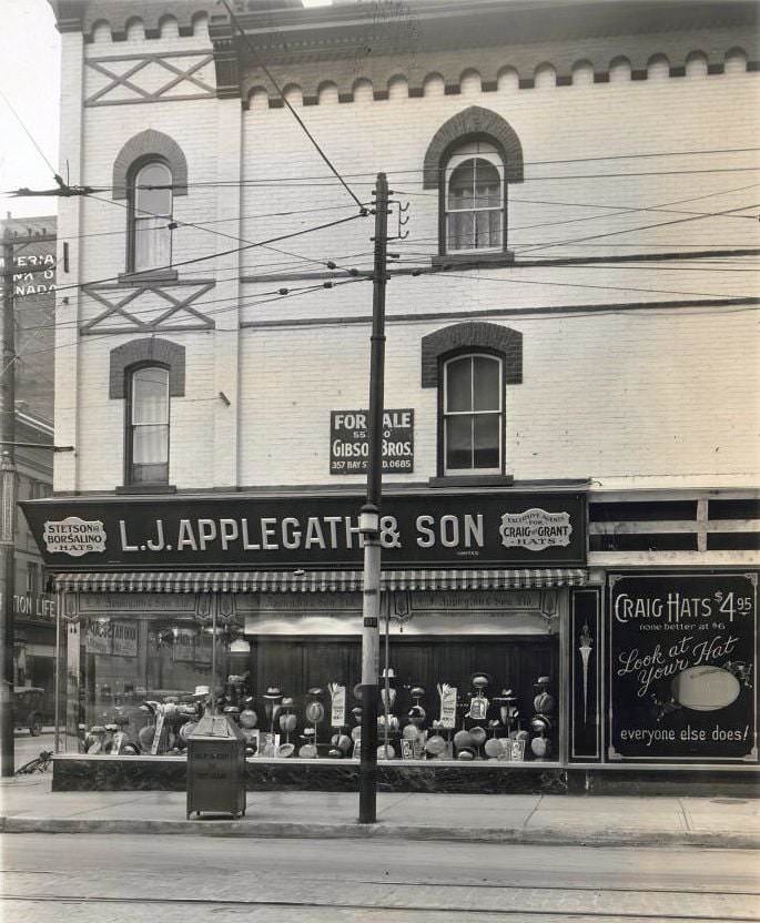 #42 L.J. Applegath & Son Limited. A storefront with signage advertising Craig Hats, 22-24 Queen Street East, at Victoria Street, north-west corner, 1920s
