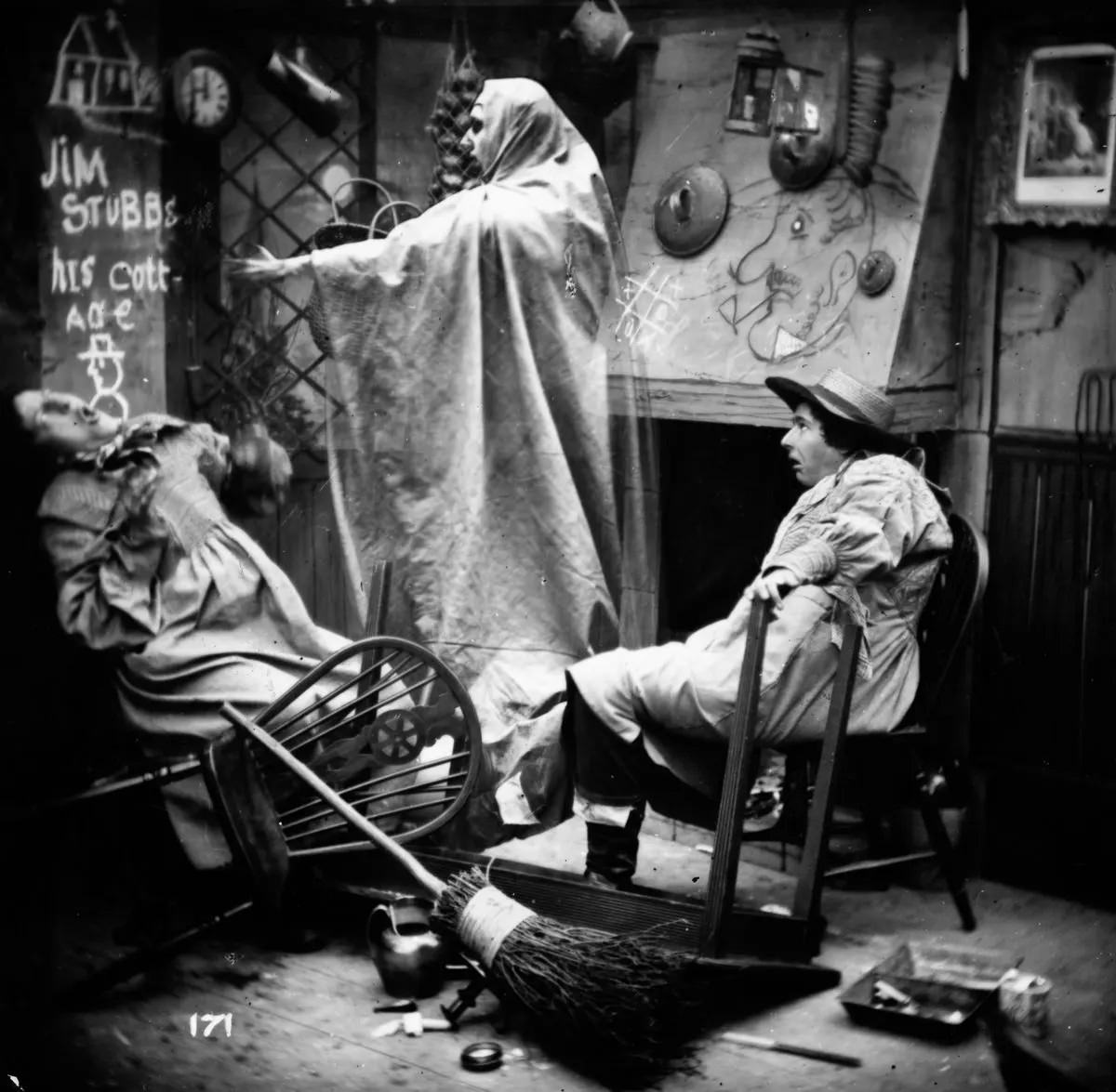 The London Stereoscopic Company created these pictures of ghostly spirits and sold them as stereographic cards, which became three-dimensional when viewed through a special viewer. The mysterious figures were achieved using double exposures and other photographic trickery.