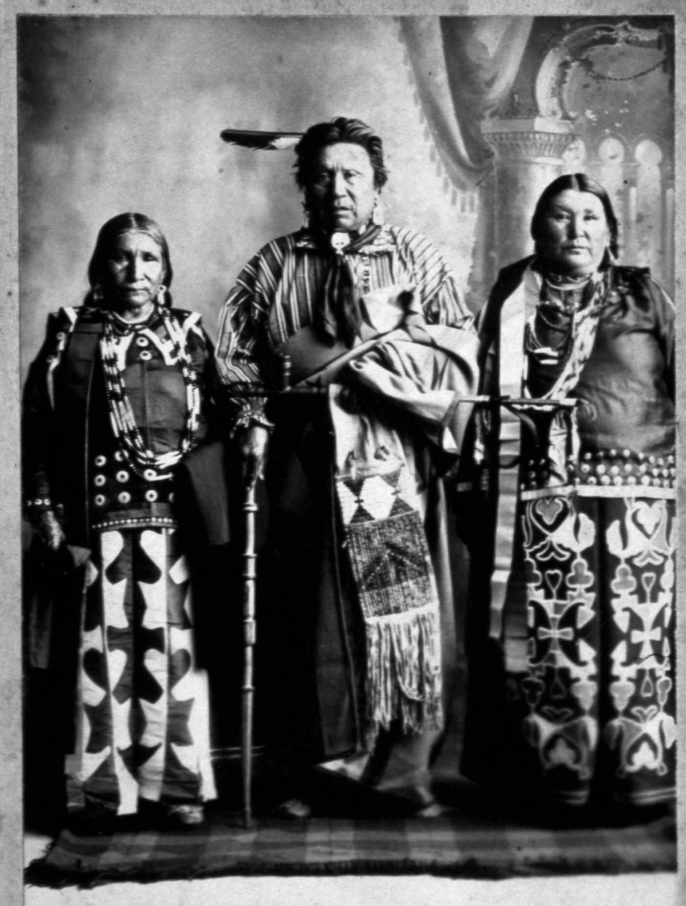 #40 Three Iowa Native Americans pose in a studio with all their finest accouterments for a photo.