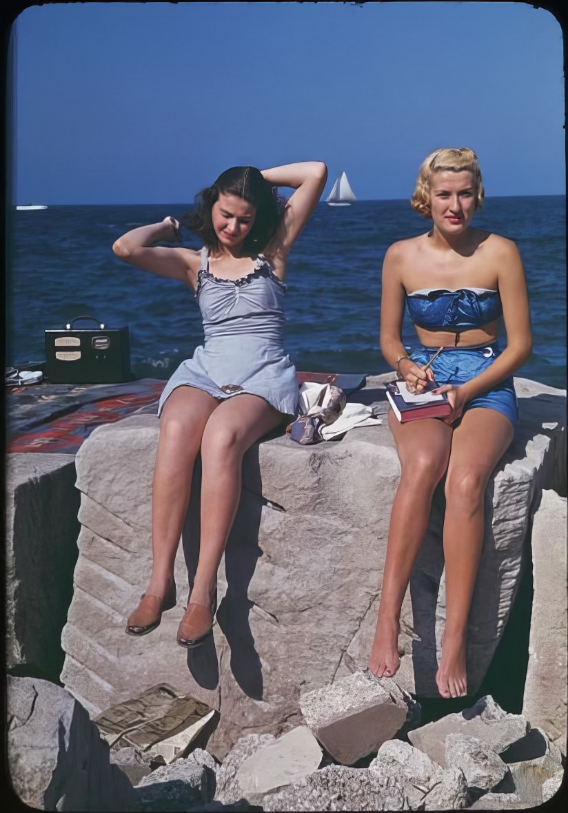 The 1940s also saw the two-piece swimsuit start to gain popularity. Don’t think of a tiny bikini, though. These two-pieces were modest by today’s standards. The bottoms were high-waisted, reaching up to the belly button or even higher. This created a smooth silhouette. The tops looked a bit like bras. They offered support and were often designed with wide straps.