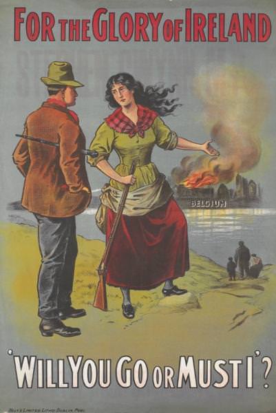 An Irish soldier stands behind English, Scottish and Welsh troops in this poster from 1915. Men were encouraged to enlist and join the war effort with this poster in Ireland, which was pursuing independence. The poster was especially aimed at Protestants and those who support unionism in this instance.