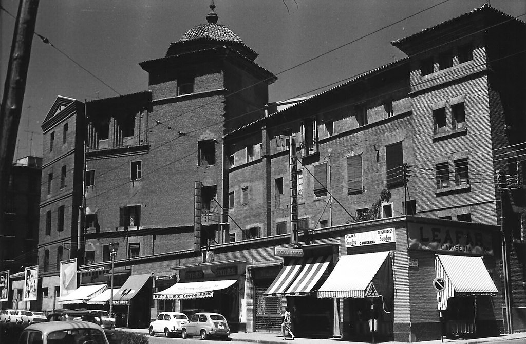 San Lázaro Barracks, evicted from its military functions, in an image captured from the beginning of the Avenida de Cataluña. After the Confiscation of Mendizábal (1836-1837), the remains of the Mercedarian convent of San Lázaro and its site on the left bank, next to the Ebro River, were used for various purposes, such as a candle factory, a straw store and a pediment. Then it was, successively, municipal warehouse, correctional prison and infantry barracks, and again municipal warehouse. From 1874 it fell again to the Branch of War, which in 1888 finished the works on the building that the image illustrates, standing until the 1980s, when after Operation Barracks it was demolished by the City Council, and the site dedicated, mostly, to car and bus parking, with a green area in the vicinity of the Stone bridge, to the right and out of shot.