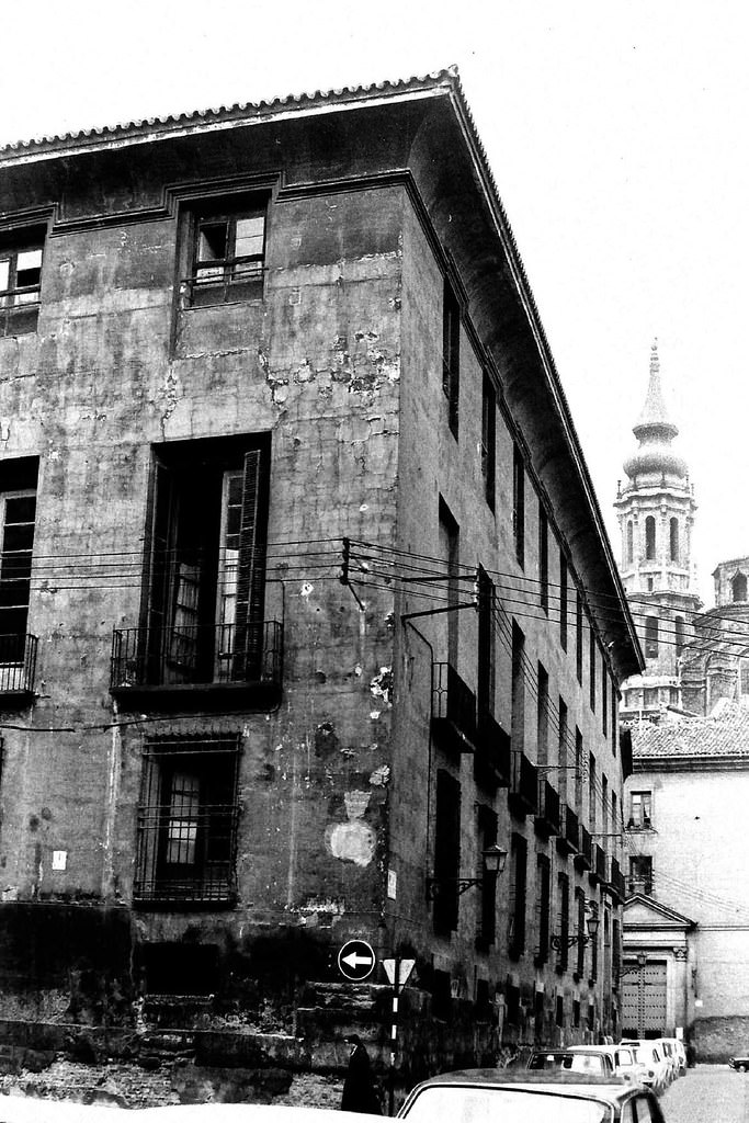 Asso square, with a view of the facade of the 16th century house that belonged to the Campi family, and then to the La Balsa family, the La Balsa-Campi family (marquisate of the Palace), and finally the Asso family. That is why this square, called Ciria in the fifteenth century, in the eighteenth was already La Balsa, and from the mid-nineteenth century Asso. In its surroundings stood a good number of houses of noble or infanzona families. After the abandonment of this house at the beginning of the 1990s, the City Council took on the restoration of the façade, cataloged as an Asset of Architectural Interest. The owners, after completely demolishing its interior, built exclusive apartments and premises, with underground garages. To the left, facades of other old buildings, later demolished, and in the background, a stretch from Calle de Gavín to Calle Palafox.